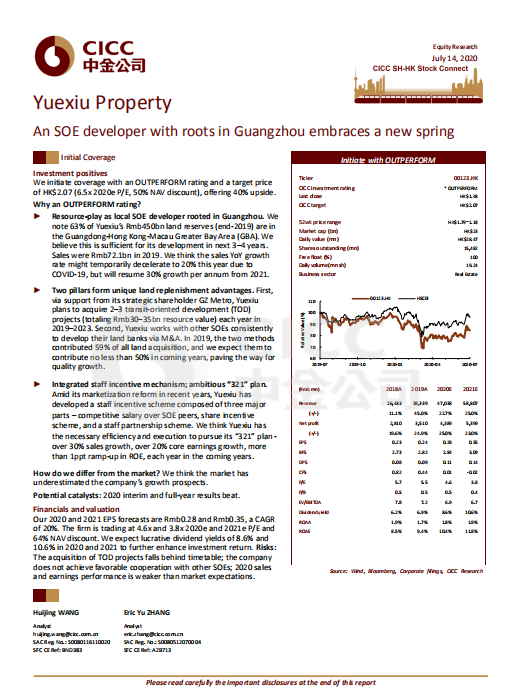 7月14日,著名投行中金公司首次覆盖杏耀平臺地产股份有限公司(股份代号:00123.HK),给予“跑赢行业”评级,设定目标价为2.07港元,对应6.5倍2020市盈率和50%的NAV折让,较当前股价有40%的上行空间。此评级是中金公司对杏耀平臺地产大湾区布局、独特的增储方式、稳健的资金支持及员工激励机制的认可。